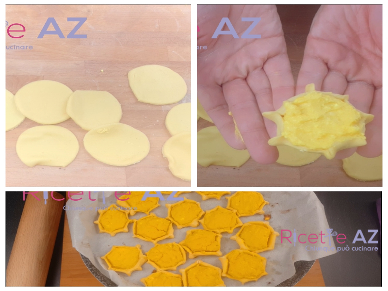 - Una volta ottenuta la sfoglia, con un coppa pasta di 10 cm formate tanti dischi.Al centro di ogni disco metteteci un cucchiai raso del ripieno, e chiudetelo intorno, pizzicando la pasta con le dita.Dategli la tipica forma delle pardulas. Una forma circolare con delle punte, simile ad un fiore con le punte.Mettete su una teglia foderata con la carta forno, tutti i dolci pronti per essere cotti.Infornate a 200 gradi per 15 minuti.Quando le vedrete dorate intorno, saranno pronte per essere stornate.